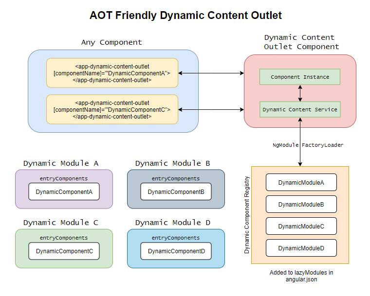 You might ask why we didn’t just add a fourth property to the DynamicContentOutletRegistry named componentType; well this is because if we import the type in the registry, then it defeats the purpose of lazy loading these modules as the the type will be included in the main bundle.