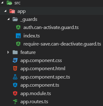 If you have guards that are only used in a particular FeatureRoutes array, then store these routes underneath a folder named _guards underneath your feature folder. Make sure to follow the same naming conventions defined above, as well as barrel exporting.